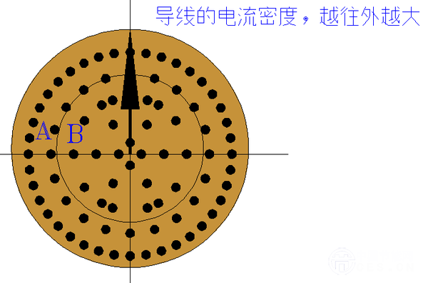 交變磁場在導(dǎo)體中產(chǎn)生反向感應(yīng)電動(dòng)勢,其作用將阻礙原電流的變化,使得通過導(dǎo)體截面的電流減少。因此離導(dǎo)體中心越近,感生電動(dòng)勢越高,阻礙原電流變化的作用越強(qiáng),導(dǎo)致導(dǎo)體中心部分的電流密度比導(dǎo)體外表部分要小。