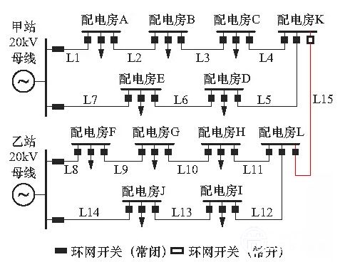 以圖2為例,若配電房K僅配置基于就地信息的常規(guī)備自投,在甲站20kV母線故障時(shí),該備自投動(dòng)作后會(huì)切除線路L4、L5靠近配電房K側(cè)斷路器,然后合上聯(lián)絡(luò)斷路器。備自投動(dòng)作后僅能恢復(fù)配電房K的負(fù)荷供電,配電房A~E負(fù)荷供電會(huì)中斷。