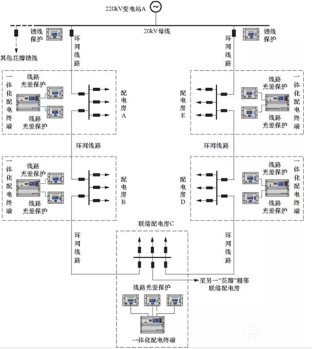 4)20kV花瓣采用光纖縱聯(lián)電流差動(dòng)保護(hù)、一體化配電終端和區(qū)域備自投作為保護(hù)與控制方案,可滿足最小范圍內(nèi)隔離故障的要求。
