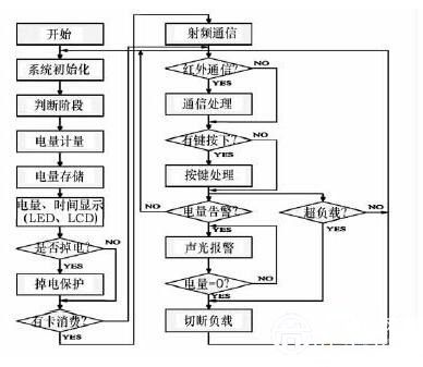 軟件是電表的靈魂所在。電能表需要完成電能計(jì)量、費(fèi)率和時(shí)段控制、查詢、顯示、電費(fèi)充值、負(fù)荷控制、事件記錄、測(cè)試輸出等功能。電能表軟件設(shè)計(jì)主要采用C語言,采用模塊化編程思想,主要包括以下幾個(gè)模塊:上電初始化模塊、主程序模塊、電量累計(jì)模塊、數(shù)據(jù)存儲(chǔ)模塊、中斷程序模塊、LCD顯示模塊、按鍵處理模塊、費(fèi)率處理模塊、實(shí)時(shí)時(shí)鐘處理模塊、射頻讀寫模塊、通訊事件處理模塊、負(fù)荷控制模塊等。主程序流程圖如圖4所示。