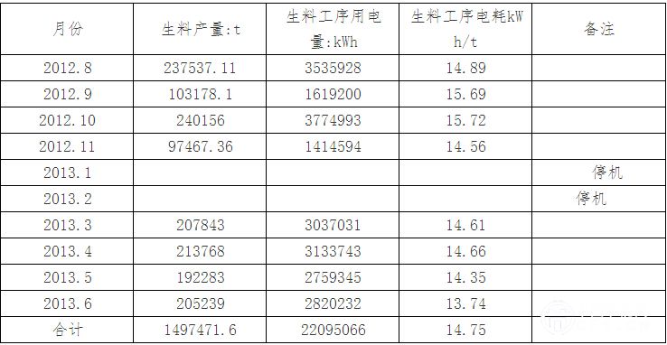 通過對項目實施前生料工序電耗統(tǒng)計(見下表),平均工序電耗14.75 kwh/t。