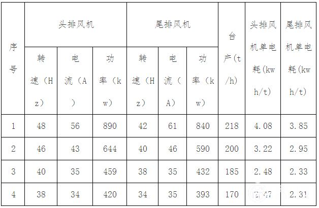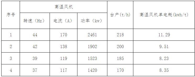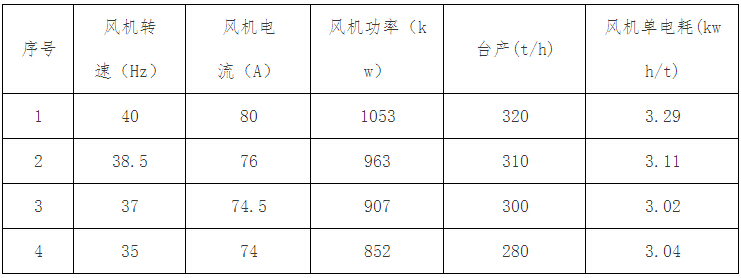 從表中數(shù)據(jù)看出,產(chǎn)量控制在280-300t/h范圍,風(fēng)機(jī)單耗3.04-3.11kwh/t,而最經(jīng)濟(jì)的運行參數(shù)應(yīng)選擇循環(huán)風(fēng)機(jī)在37Hz,臺產(chǎn)300t/h。課題組決定暫按此參數(shù)運行,在運行過程中,再通過操作員的摸索,探索出更優(yōu)化的參數(shù)。我們認(rèn)為,只要操作員逐步適應(yīng)后,單耗還有降低的空間。