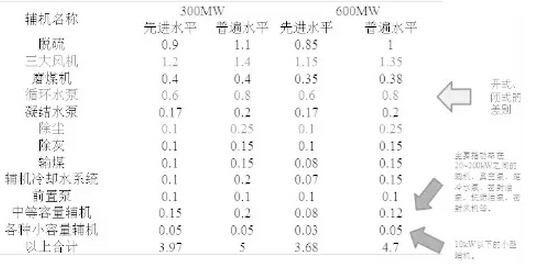 (3)輔機(jī)(耗電率):三大風(fēng)機(jī)、循環(huán)水泵、制粉系統(tǒng)、凝結(jié)水泵、脫硫、除塵、輸煤等。