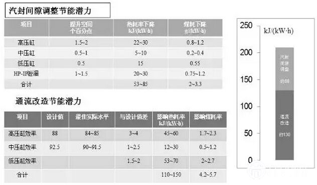 說明:目前國內(nèi)經(jīng)過通流部分改造后的300兆瓦亞臨界機(jī)組熱耗率水平仍高于理想水平約100千焦/千瓦時(shí),但低于未經(jīng)改造的引進(jìn)型機(jī)組約100千焦/千瓦時(shí),約3.7千焦/千瓦時(shí)。