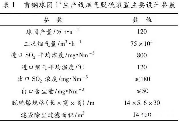 首鋼球團(tuán)廠一直采用首鋼礦業(yè)公司自產(chǎn)精礦粉為生產(chǎn)原料。為了提高球團(tuán)礦品位和綜合入爐品位,降低高爐渣比與焦比,提高高爐利用系數(shù)與技術(shù)經(jīng)濟(jì)指標(biāo),自2014 年1 月份開始進(jìn)行提鐵降硅工業(yè)生產(chǎn)實(shí)踐,改用 60% 的自產(chǎn)精礦粉 +40%秘魯精礦粉進(jìn)行氧化球團(tuán)生產(chǎn)。經(jīng)檢測,自產(chǎn)精礦粉與秘魯精礦粉的含硫量分別為0. 089% 與0. 18%。原料改變的直接后果是生產(chǎn)煙氣中二氧化硫的含量大幅提高,脫硫裝置進(jìn)口煙氣SO 2 含量由750 mg/m 3 升高至1 100mg/m 3 。為了達(dá)到本地環(huán)保部門規(guī)定的外排煙氣出口SO 2 含量≤180 mg/m 3 的要求,對(duì)原有的脫硫系統(tǒng)進(jìn)行了優(yōu)化與改造。