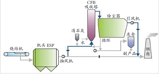 干法脫硫是指脫硫劑在干燥狀態(tài)下進行脫硫和副產(chǎn)物處理的燒結(jié)煙氣脫硫技術(shù)。干法燒結(jié)煙氣脫硫技術(shù)目前工業(yè)化應(yīng)用的主要有:循環(huán)流化床法、活性炭吸附法和密相干塔法等,應(yīng)用較多的是循環(huán)流化床法。