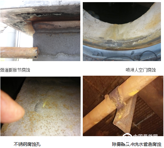 山東xxx碳素廠脫硫工程。工藝采用雙堿法脫硫,脫硫塔采用碳鋼內(nèi)襯不銹鋼的施工工藝。運(yùn)行3個(gè)月后,先后凈煙氣膨脹節(jié)、人孔門焊口、塔壁出現(xiàn)了腐蝕穿孔,除霧器生銹,除霧器沖洗水管道不銹鋼固定卡腐蝕脫落。且腐蝕多次集中噴淋人口里外側(cè),及煙氣進(jìn)口較為嚴(yán)重的泄露。雖多次采取焊補(bǔ)進(jìn)行修復(fù),但效果不佳,不能從根本上解決問題。