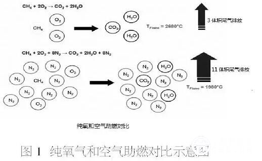 顧名思義,富氧燃燒即是指在燃燒過程中,把氧氣的體積分數(shù)大于空氣中的21%氧氣含量的氣體作為助燃氣體的一種高效燃燒技術(shù),當助燃氣體直接采用99%以上的工業(yè)純氧時,又叫做純氧燃燒。富氧燃燒技術(shù)可以增加燃燒火焰溫度、減少一次風(fēng)抽送量,同時節(jié)約了燃料消耗、減少了尾氣排放。純氧氣和空氣助燃對比示意圖如圖1所示。