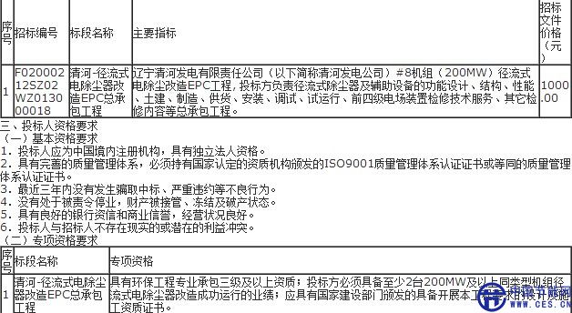 遼寧清河發(fā)電公司1×200MW(#8機組)徑流式電除塵器改造EPC總承包工程招標二次公告