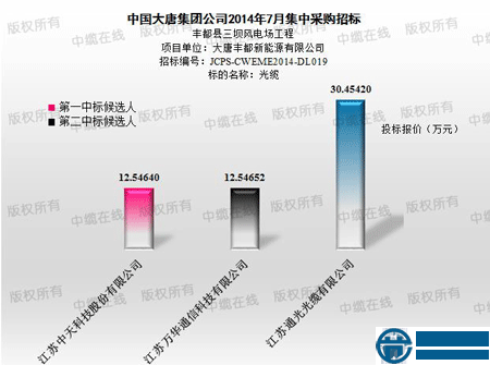 7月15日,大唐重慶豐都三壩風(fēng)電場工程光纜采購開標會在北京萬商花園酒店隆重舉行。根據(jù)現(xiàn)場唱標記錄,該標段僅有3家企業(yè)參與競標,分別是江蘇中天科技股份有限公司,投標報價12.5464萬元;江蘇萬華通信科技有限公司,投標報價12.54652萬元;江蘇通光光纜有限公司,投標報價30.4542萬元。如下圖: