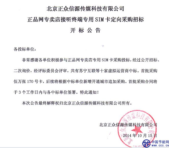C114訊 10月17日消息(張海龍)在8月份公開向虛商進(jìn)行SIM卡招標(biāo)的正品網(wǎng)于日前完成了首期招投標(biāo)活動(dòng),本次招標(biāo)共涉及5萬個(gè)SIM卡號(hào)碼,蘇寧,迪信通等10家虛商中標(biāo)。
