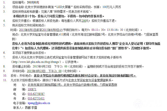 北京大學(xué)實(shí)驗(yàn)室與設(shè)備管理部受北京大學(xué)委托,對(duì)下述貨物及服務(wù)進(jìn)行國(guó)內(nèi)公開招標(biāo)。現(xiàn)邀請(qǐng)合格的投標(biāo)人前來(lái)投標(biāo)。