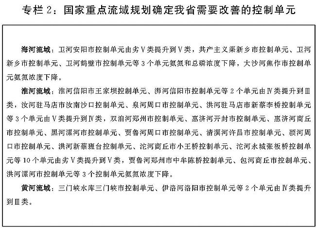 3.深化重點(diǎn)流域治理。采取加快產(chǎn)業(yè)結(jié)構(gòu)調(diào)整、污染源治理、截污、清淤、生態(tài)修復(fù)、生態(tài)補(bǔ)水等措施,著力改善污染嚴(yán)重河流水質(zhì),推進(jìn)衛(wèi)河、共產(chǎn)主義渠、清潩河、雙洎河、潁河、洪河、黑泥泉河、宏農(nóng)澗河、蟒河等河流綜合整治。實(shí)施重點(diǎn)流域治污減排、河道清淤疏浚、河道生態(tài)修復(fù)等工程,打通“斷頭河”,實(shí)現(xiàn)水通、水暢、水凈。到2019年,省轄海河流域水質(zhì)優(yōu)良比例達(dá)到46.7%,淮河流域水質(zhì)優(yōu)良比例達(dá)到50%,黃河流域水質(zhì)優(yōu)良比例達(dá)到66.7%,長(zhǎng)江流域水質(zhì)優(yōu)良比例達(dá)到90.9%。到2020年,各流域水質(zhì)穩(wěn)定達(dá)標(biāo)。